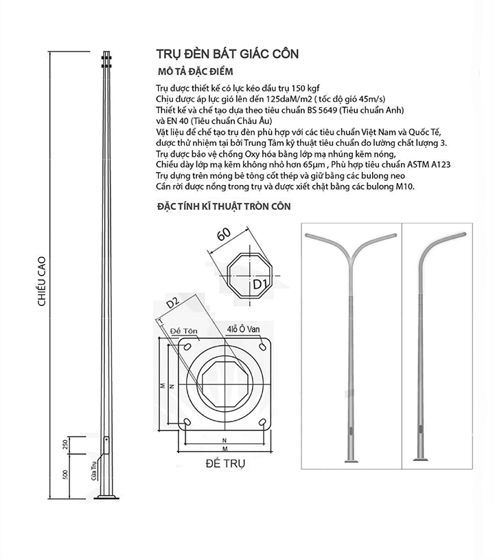 Thông số kỹ thuật Cột Đèn Cao Áp Bát Giác